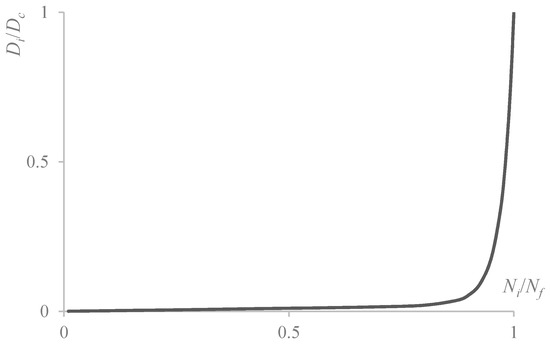 Under a certain level of repeated load stress, the relationship between material damage variables and the number of repeated cycles can be generally qualitative, as shown in Figure 1 [39]. In Figure 1, Nf is the number of cycles when fatigue failure occurs (which is related to the level of cyclic loads). The accumulation rate of damage generally increases with an increase in material damage. During the initial stage of fatigue loading, the damage amount and evolution rate are small, whereas the amount of damaged material will increase rapidly when the material is close to failure.