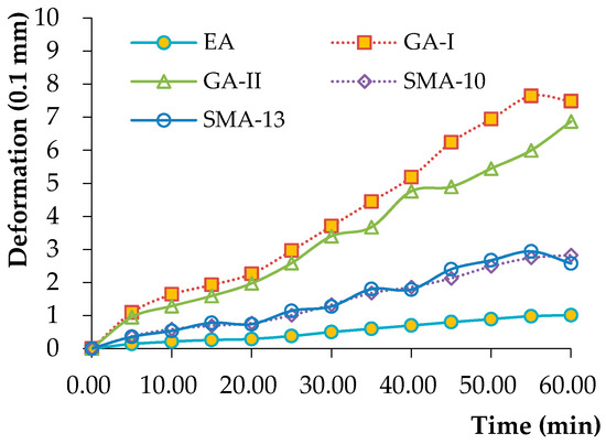 The thermal stability of the EA concrete was assessed by the rutting test (T0719-2011) [40]. The size of the sample used in the rutting test was 300 mm × 300 mm × 50 mm. The test was conducted at 70 °C under drying conditions since the highest temperature of the paving layer can reach 70 °C. During the rutting test, the pressure under the solid-rubber wheel was 0.7 MPa, and the traveling speed of the wheel was 42 cycles/min. The effects of temperature and stress level on the rutting performance of matrix asphalt concrete were very significant. With the increase of time, the amount of rutting deformation increases. The higher the temperature and load level were, the larger the rutting deformation increment was. Figure 2 shows the rutting deformation of the specimen over time. As far as deformation is concerned, GA was the largest, followed by SMA, with EA being the smallest. It is seen that the rutting deformation of the EA concrete was low; i.e., the rutting deformation at 60 min was only 1.01 mm, which indicates that the EA concrete used in this study possesses good stability at high temperatures.