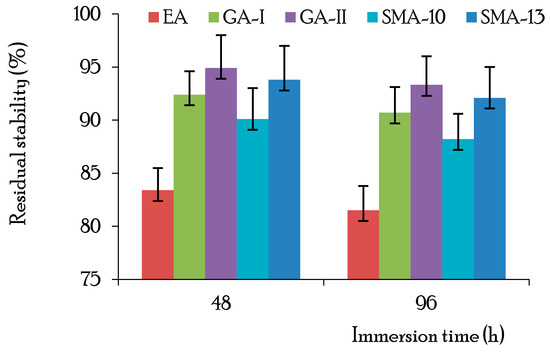 The water stability of the asphalt concrete was evaluated by the immersion Marshall stability test (T0717-1993) [40]. The immersion Marshall stability test is similar to the standard test except that the specimens are immersed in water at constant temperature for 48 and 96 h. The measured residual stabilities of the immersed specimens are shown in Figure 3. It is seen that the average residual stability of the immersed specimens was greater than the design criterion (80%), and the immersion time had a minor effect on the residual stability, which indicates that all three types of materials used in this study possess good water stability [40].