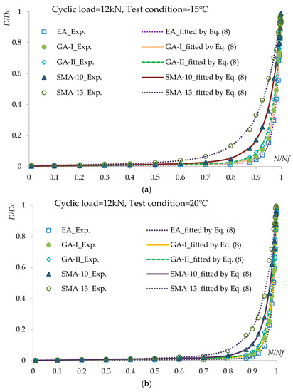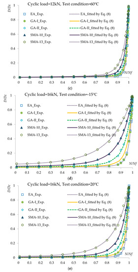 In order to predict the fatigue lives of asphalt concretes under different loading levels by the damage-mechanics-based fatigue life model described in Section 2.1.2, one should determine the material parameters , , and in Equation (8). The relationship between and under loading cycle levels of 10 and 12 kN and test conditions of −15, −20, and 60 °C for the fatigue tests are shown in Figure 6a–f. The results fitted by Equation (8) are also displayed in Figure 6 as curves. The fitted results are in good agreement with the experimental results, which suggests that Equation (8) can characterize the relationship between and well.