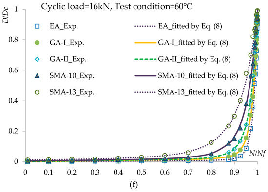 Relationship between x = N/Nf and D = Di/DC under different loading cycle levels and test conditions: (a) cyclic load = 12 kN, test condition = −15 °C; (b) cyclic load = 12 kN, test condition = 20 °C; (c) cyclic load = 12 kN, test condition = 60 °C; (d) cyclic load = 16 kN, test condition = −15 °C; (e) cyclic load = 16 kN, test condition = 20 °C; (f) cyclic load = 16 kN, test condition = 60 °C.