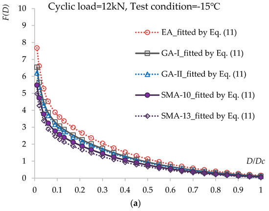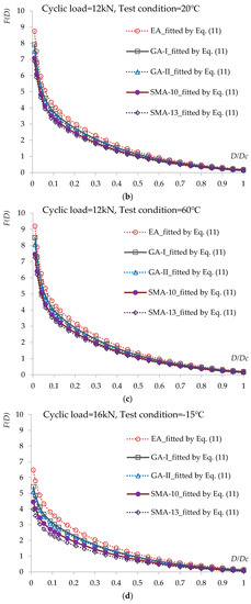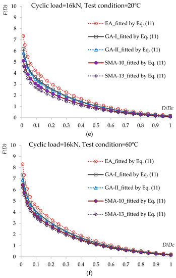 Relationship between accumulated energy F(D) and damage evolution D = Di/DC under different loading cycle levels and test conditions: (a) cyclic load = 12 kN, test condition = −15 °C; (b) cyclic load = 12 kN, test condition = 20 °C; (c) cyclic load = 12 kN, test condition = 60 °C; (d) cyclic load = 16 kN, test condition = −15 °C; (e) cyclic load = 16 kN, test condition = 20 °C; (f) cyclic load = 16 kN, test condition = 60 °C.