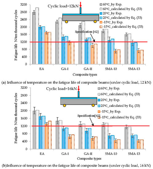 - Temperature is one of the main factors affecting the fatigue life of asphalt pavement on a steel bridge deck. The fatigue life of the deck pavement decreases with temperature, as shown in Figure 8. This could be attributed to the increase in the elastic modulus of the asphalt mixture at lower temperatures, which results in an evident increase in the stress concentration and peak stress. Under the low-temperature condition of −15 °C, the EA deck pavement system achieved better anti-fatigue performance and could meet the design requirements of the steel deck pavement (Nf > 1200, for 10,000 cycles) [42]. Moreover, EA mixtures have been successfully applied in the Third Nanjing Yangtze River Bridge (2005), the North Branch Bridge of the Runyang Yangtze River (2005), and the Sutong Yangtze River Bridge (2008), which have withstood the local climate and traffic conditions for over 10 years. However, GA-I/II and SMA-10/13 showed poor fatigue endurance at lower temperatures (Nf < 12, for 10,000 cycles); thus, they failed to meet the design requirement for steel bridge deck pavement.