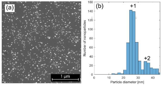 SEM image of the nanoparticles with the graph showing the size distribution. (a) The SEM image, showing nanoparticles evenly dispersed on the SiOx substrate; (b) The size distribution of the particles selected by the DMA. Singly charged particles that pass through the DMA have a diameter of 25 nm, while a small fraction of doubly charged particles has a diameter of 35 nm.