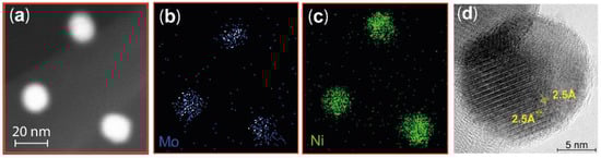 (a) Typical STEM HAADF image of three nanoparticles. An example of STEM XEDS mapping of Mo (b) and Ni (c) indicating that the Ni and Mo are homogeneously mixed in all three nanoparticles. The scale is the same in (a–c). (d) The high-resolution TEM image of one nanoparticle shows that the nanoparticles have a crystalline structure with a lattice distance of 2.5 Å.
