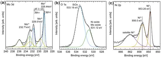 Alloy formation is also evident in the Ni spectrum (Figure 3c). Two sharp peaks, as well as a broad feature, are observed in the Ni 2p3/2 region. The first sharp peak at 853.20 eV is observed at ~0.5 eV higher binding energy than tabulated for metallic Ni (852.7 eV [33]), but we assign this component to metallic Ni (Ni0) due to the presence of metallic Mo. The second component is observed at 856.0 eV, and is in good agreement with literature values for a Ni2+ species in NiMoO4 [34,35]. The Ni2+ species may also originate from Ni2O3 due to the high Ni content of the particles. The broad component in the Ni 2p3/2 region is believed to be a Ni2+ satellite feature, in agreement with previous observations [34].