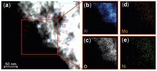 Elementary analysis was performed at 26 different positions (10 × 10 nm2) on the industrial sample using STEM-XEDS, and the atomic percentage of Al, O, Ni, and Mo was determined. The Ni:Mo ratio is highly relevant for the activation of the catalyst, and the average atomic percentage of the active metals was calculated to be 29% Ni and 71% Mo (SD 2.9), resulting in an average Ni:Mo ratio of 0.4 (Table 2). The homogeneous dispersion of Ni and Mo indicates that the Ni and Mo are well mixed, and that an alloy is probably formed.