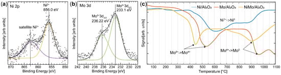 Despite the fact that a well-ordered alloy structure is not formed, the interaction between Ni and Mo is important for the activity of the catalyst, as can be shown using a combination of XPS and H2-TPR to probe the chemical information of the catalyst (Figure 6). The XPS study of the insulating industrial samples was conducted under 1 mbar of air, showing that the charging effect that occurs can be effectively reduced by the presence of a gas [39]. Two peaks can be resolved in the Mo 3d XPS spectrum at binding energies of 233.1 eV and 236.2 eV (Figure 6b). Similar peaks were found in the Mo 3d region in the investigation of the NiMo nanoparticles, and thus the peaks are assigned to the Mo6+ oxidation state with a spin-orbit splitting of 3.1 eV. As mentioned above, peak assignment is not trivial, and the Mo6+ component may be correlated to the NiMoO4 alloy, pure MoO3, or a molybdate in Al2(MoO4)3 [40,41,42]. A component is observed in the Ni 2p3/2 spectrum at a binding energy of 856.0 eV, similar to the nanoparticle, and is accordingly assigned to a Ni2+ species. It should be noted that no metallic Ni or Mo is observed in the XPS spectra. Based on the XPS results in combination with the PXRD data, we can assign the Ni2+ and Mo6+ species to the NiMoO4 alloy [43]. The Ni:Mo ratio was calculated using the same procedure as for the nanoparticles, resulting in a value of 0.3, which is in good agreement with the ratio calculated from XEDS (0.4). The ratio determined by XPS is expected to be similar to that determined by XEDS as the well-dispersed Ni and Mo do not give rise to any significant difference in the ratio between the surface and bulk, as was observed for the nanoparticles.