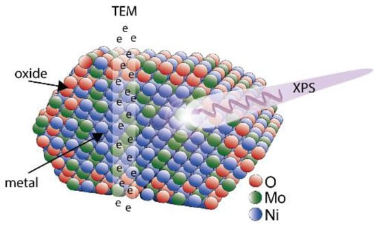 A schematic of the NiMo nanoparticle produced, where the high energy of the electrons in TEM-XEDS probe a cross-section of the particle, while XPS provides information of the surface. The XPS results indicate oxide formation on the outer atomic layers with a higher Ni content than in the core of the particles.
