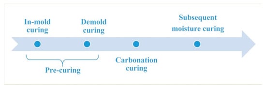 Carbonation curing is a new method of curing that is different from the natural carbonation of mature concrete. As the main hydration product in mature concrete, calcium-silicate-hydrate (C-S-H), reacts with atmospheric CO2, eventually becoming a silica gel and losing its binding capability in the process of natural carbonation. However, carbonation curing of concrete means that the concrete is cured in a high-pressure atmosphere of pure CO2, and the unhydrated cement minerals react with CO2 to solidify it in concrete in the form of carbonate. Hence, the hardening process of concrete is accelerated and its mechanical and durability properties are improved [9,10,11,12,13,14,15]. When carbonation curing technology is applied in precast concrete, it not only reduces the carbon emissions of precast concrete products, but also improves the performance of precast concrete.