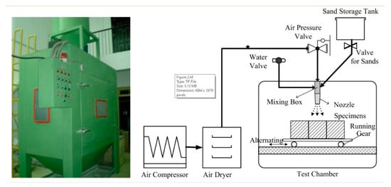The abrasion resistance of concrete samples was tested in a self-designed experimental device [22,23]. The schematic is shown in Figure 2. In this device, the rate of erosion can be varied by adjusting the pressure of the compressed gas. The angle of impact can be changed by a variable angle stage. The specimen can be reciprocated via running gear in the test chamber. Through the programmable control system, parameters such as the abrading time and the number of cycles can be customized. In addition, the device was also equipped with a dust collection system to ensure that it meets environmental requirements.