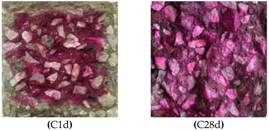 Figure 4 shows the sections of C1d and C28d sprayed with phenolphthalein ethanol solution. It can be seen from Figure 4 that after 12 h of carbonation curing, the pH value of the surface of the concrete within 10 mm is less than 9.5 and no discoloration reaction occurred. In the central region of the concrete, the pH is greater than 9.5 and the sample has a purplish red color. From the color reaction of C28d, it can be seen that the entire section of the sample shows a purple-red color, which indicates that after 27 days of subsequent conventional curing, the pH of the entire section of the carbonation-cured concrete is above 9.5.