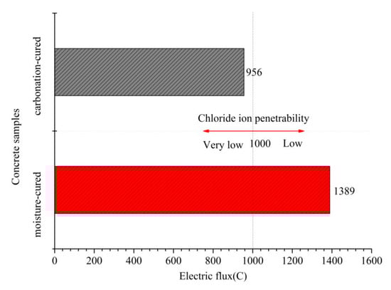 Figure 5 shows the electric flux of the carbonation-cured and moisture-cured concrete. It can be seen from Figure 5 that the electric flux value of the carbonation-cured concrete is 956 C which is less than the 1389 C of the moisture-cured concrete. These results indicate that the anti-chloride ion permeability of the carbonation-cured concrete is superior to that of moisture-cured concrete. According to the ASTM C1202 standard for evaluating the chloride ion permeability of concrete [29], the chloride ion permeability of carbonation-cured concrete is characterized as very low.