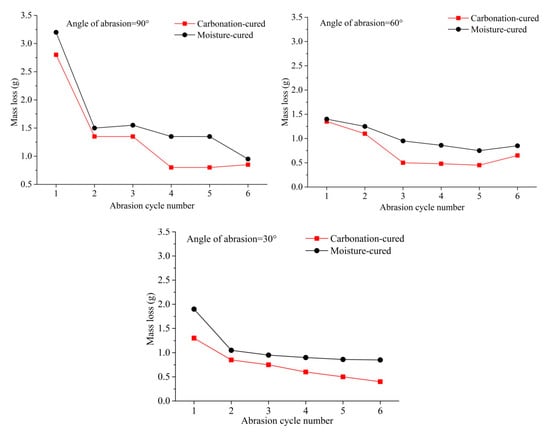 The variation in the mass loss of concrete with the number of abrasion cycle under different angles is shown in Figure 6. It can be seen from Figure 6 that the mass loss of the concrete at the first abrading time is the largest regardless of the angle of abrasion. This is mainly due to a layer of paste on the surface of the sample, which is easily detached from the surface under the impact and cutting of the sand. In addition, it can be seen from Figure 6 that the mass loss of the carbonation-cured concrete is smaller than that of moisture-cured concrete at different angles and different cycles. Studies have shown that when the aggregate of concrete is the same, the abrasion resistance of concrete increases with the increase in compressive strength. Therefore, the results of the abrasion resistance are consistent with the laws of the compressive strength.
