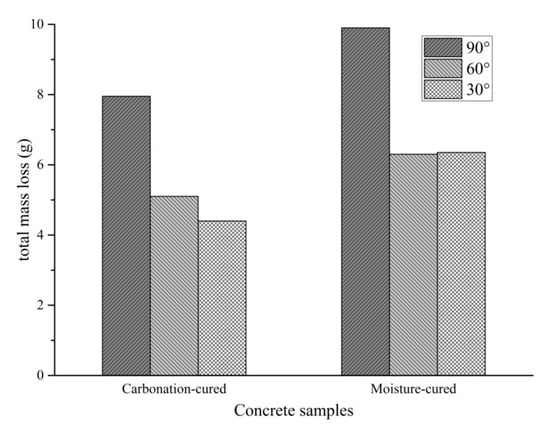 The total mass loss after six cycles of abrading of the sample is shown in Figure 7. According to abrasion erosion theory, the stable mass loss rate of brittle material is largest when the angle of attack of the erosion medium is close to 90°, while the maximum value of the stable mass loss rate of plastic material occurs when the angle of attack is 20°–30°. Therefore, when the abrading angle of the concrete is 90°, the mass loss is significantly greater than 60° and 30°. At the angle of 90°, the effect of sand on concrete is impact damage. Figure 7 shows that the total mass loss of carbonation-cured concrete at the angle of 90° is smaller than that of the moisture-cured concrete. This indicates that the carbonation-cured concrete has better abrasion resistance than conventionally-cured concrete. Considering the difference in the mass loss at the abrading angles of 60° and 30°, there is almost no difference in the total mass loss in the moisture-cured concrete at the two abrasion angles, while for the carbonation-cured concrete, the mass loss at the abrasion angle of 30° is less that at the abrasion angle of 60°. At the abrasion angle of 30°, the effect of the abrasive sand on the concrete surface is mainly cutting, which indicates that the carbonation-cured concrete has better cutting resistance than moisture-cured concrete.