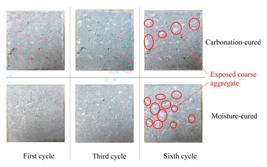 Figure 8 shows the surface morphology of the concrete after different cycles of abrasion angle at 90°. It can be seen from Figure 8 that after the abrading, the floating layer of the concrete is washed away and the mortar leaks. After three cycles of abrading, aggregates appears in the concrete under both curing methods, but the difference is small. However, it is apparent from the surface morphology after six cycles of abrading that the moisture-cured concrete has more exposed aggregates than the carbonation-cured concrete. This indicates that the carbonation-cured concrete has better abrasion resistance than moisture-cured concrete.