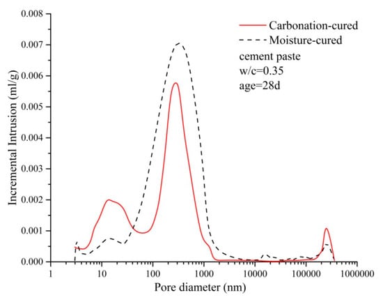 Figure 9 shows the pore size distribution curves of the carbonized and hydrated paste samples and there is a clear difference between the two curves. The carbonation-cured paste has a distinct peak at around 10 nm, while the moisture-cured paste has a weak peak here. At 100–1000 nm, the peak area of the moisture-cured paste is significantly larger than that of the carbonation-cured concrete. The integrated area of the curve shows that the total porosity of the moisture-cured paste is greater than that of the carbonation-cured concrete. According to the pore size, the pores are divided into the following ranges: pores below 20 nm are harmless pores; pores of 20–50 nm are less harmful pores; pores of 50–100 nm are harmful pores; and pores above 100 nm are more harmful pores [31,32]. According to the mercury intrusion test data, the pore structure parameters of the carbonation-cured paste and moisture-cured paste were counted and are shown in Table 7. Table 7 shows that the ratio of harmless pores and less harmful pores of the paste is improved after carbonation curing, while the proportion of harmful pores decreases. This is consistent with the test results for macro strength and impermeability. The decrease in the proportion of harmful pores reduces the macroscopic defects of the paste, so as to improve the strength of the concrete [33,34,35]. At the same time, the decrease in the proportion of the more harmful and the harmful pores reduces the proportion of connected pores inside the paste, so as to improve the impermeability of concrete [36,37].