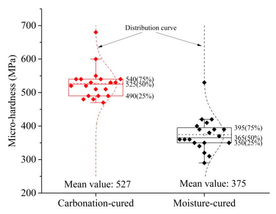 Since the data for micro-hardness is highly discrete, the data was processed using a box plot, and the processed data is shown in Figure 10. Outliers can be removed by box plots, making data analysis more reliable. Figure 10 shows that the quartile distance of the two sets of data is small, indicating that the data error is small. Therefore, the average value of the sample is taken as the micro-hardness value of the paste. The micro-hardness of the carbonation-cured paste is 527 MPa, which is 40% greater than that of the moisture-cured paste, which is 375 MPa. The higher the hardness value of the paste, the better the abrasion resistance [22,23,38,39], so the results for micro-hardness explain why the abrasion resistance of carbonation-cured concrete is higher than that of moisture-cured.