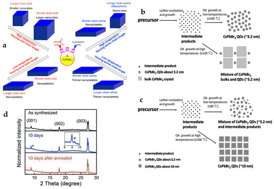 (a) Summary of the shape and size dependence on the chain length of carboxylic acids and amines. Reproduced with permission [19]. The growth processes of CsPbBr3 quantum dots (QDs) in (b) tetra-ethylene glycol dibutyl ether (EGDBE) with the high polarity, and (c) EGDBE with the low polarity at different temperatures. Reproduced with permission [22]. (d) X-ray diffraction (XRD) patterns of as-synthesized Cs3Bi2X9 NCs (black), Cs3Bi2X9 NCs stored in open air for 15 days before (blue) and after annealing (red). There is no other observed peak at 2θ higher than 30° in the complete pattern. Reproduced with permission [23].