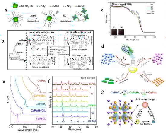 (a) Structural lability of CsPbX3 nanocrystals (NCs) due to the desorption of weakly bound ligands. Reproduced with permission [43]; (b) Precipitation quantities influenced by oleic acid (OA) and (3-amino-propyl)triethoxysilane (APTES) ligand capping effects. Reproduced with permission [48]; (c) Comparison of absorption spectra of CsSnBr3 nanocages after treatment with perfluorooctonoic acid (PFOA) at different exposure time. Inset: films were prepared by drop-casting the solution on a glass slide and exposure in air (25 °C, RH 60%). Reproduced with permission [50]; (d) Schematic illustrating the formation process for different CsPbX3 (X = Cl, Br, I) nanocrystals mediated by organic acid and amine ligands at room temperature. Reproduced with permission [37]; (e) Typical optical absorption and PL spectra of CsPbX3 NCs after post-synthetic anion exchange reactions. Reproduced with permission [17]; (f) XRD patterns of the parent CsPbBr3 NCs and anion-exchanged samples in cubic phase. The top pattern for purely CsPbI3 NCs shows some secondary phase (e.g., orthorhombic) in addition to the parent cubic phase; (g) Schematic of the anion-exchange within the cubic perovskite crystal structure of CsPbX3. Reproduced with permission [55].
