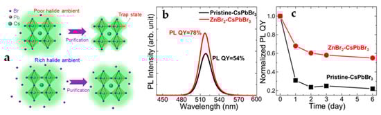 Halide composition engineering is recognized as a major approach to tune the structural and optical properties of both Pb-based and Pb-free PNCs. As one key parameter, the elemental ratio of halide/metal (X/B) severely influences the synthesis to obtain high quality and stable PNCs. Typically, for Pb-based PNCs, the ratio of X/Pb ranging from 2:1 to 4:1 has been verified to achieve higher PLQYs, longer PL lifetimes, and more stabilized NCs, as reported by Wang et al. [115]. The enhancement of overall optoelectronic properties upon the above-mentioned halide-rich synthesis could be attributed to the reduced traps on the surface halide vacancies of as-formed PNCs [115]. The same authors proposed a scheme of CsPbBr3 PNCs synthesis in halide-poor and halide-rich circumstances (Figure 3a) [115]. Due to the ligands easily peeled off from the surface of PNCs during the purification in a halide-poor circumstance, the PLQY of as-formed PNCs was dramatically decreased. On contrast, by adding more amount of oleylammonium bromide that surrounds the PNCs, the halide can effectively remain on the surface of PNCs, preserving the condition for self-passivation. The Br-rich capping can occupy the surface vacancies while passivating the surface where the electron traps allocate, resulting in improved structural stability and PLQY of CsPbBr3 PNCs [15]. In addition, the durability of PNCs during the purification and device manufacturing can be enhanced in the halide-rich stoichiometry [13]. Woo et al., used inorganic ZnBr2 as an additional source of bromide into the PbBr2 precursor for synthesis [116]. The resulting PNCs showed more halide-rich stoichiometric compositions (Cs:Pb:Br = 1.0:1.2:3.4) than that produced from the standard synthetic method without metal bromide (Cs:Pb:Br = 1.0:1.0:2.8). With this so-called “inorganic passivation”, the stability and initial PLQY of as-synthesized CsPbBr3 PNCs were considerably improved (Figure 3b,c) [116]. Instead of PbX2 as the standard halide source, Imran et al., employed benzoyl halides to synthesize a whole family of fully inorganic and hybrid PNCs, i.e., CsPbX3, FAPbX3, and MAPbX3, demonstrating a good phase purity and stability with the precise size control [117]. With a similar concept, Creutz et al., utilized silyl halides as the halide sources to synthesize the Pb-free DP Cs2AgBiX6, resulting in highly stable PNCs specifically tuned for a halide-rich ambient [118].