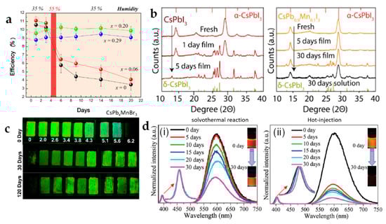 (a) Power conversion efficiency variation of the heterojunction solar cells based on MAPb(I1−xBrx)3 (x = 0, 0.06, 0.20, 0.29) with time stored in air at room temperature without encapsulation. Reproduced with permission [119]; (b) Stability of CsPbBr3 PNCs and CsPbxMn1-xBr3 PNCs. Reproduced with permission [120]; (c) PL emission photographs for CsPbBr3:Mn PNCs QDs coated on the surface of a glass slide with different Mn2+ contents from 0 to 6.2 mol % taken under UV irradiation at indicated time periods. Reproduced with permission [121]; (d) Variation of photoluminescence (PL) spectra of the Mn-Doped CsPbCl3 samples prepared by (i) solvothermal reaction and (ii) hot injection method with the extension of preservation time (0–30 days). Reproduced with permission [127].