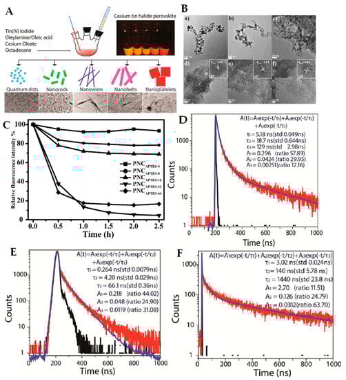 (A) Overview of the procedures for the synthesis of perovskite Cs2SnI6 nanocrystals with controlled morphology and TEM images of the PNCs with different shapes. Reproduced with permission [25]; (B) TEM images of PNCs with different sized prepared with different concentrations of APTES capping ligands; (C) The relative fluorescence intensity of PNCAPTES precipitate as a functional of time in isopropanol. Reproduced with permission [48]; (D–F) Time-resolved PL decay and fitting curves of the light emission at 515 nm (D, nanocubes), 514 (E, nanorods) or 510 (F, nanoplatelets) from different shaped CsPbBr3 NCs with a 375-pulse laser. Reproduced with permission [37].