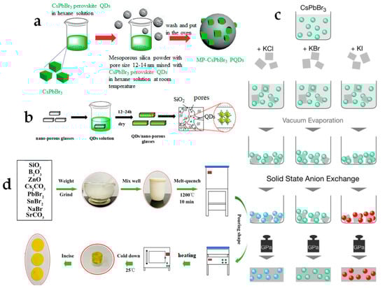 One of the easiest ways of producing perovskite-based composites is the integration of PNCs colloidal solution into the protective solid porous media, by the direct placing of the matrix into the solution (Figure 6b). The porosity of the media allows the PNCs to penetrate into its volume and thus be more stable upon environmental exposure. However, the stability of the material remains questionable and strongly depends on the properties of the used matrix, such as the size and the volume of the porous media. Han et al. [134] prepared composite materials by soaking as-prepared borosilicate glass in PNCs colloidal solution. They obtained CsPbBr3/glass, CsPb(Cl0.5Br0.5)3/glass and CsPb(Br0.4I0.6)3/glass composites, whose stabilities were tested. CsPbBr3/glass composite showed the best performance among all composites. The sample demonstrated relatively high thermal stability (up to 280 °C) and more than 12 h of resistance to UV-light. Integration of the PNCs (CsPbX3, where X = Cl/Br, Br, I) into the porous opal matrices, which were grown from amorphous SiO2 spheres, was reported in [136]. The stability of the samples kept in ambient conditions for a month, was investigated by tracking the changes of PL peak position, PL full width at half maximum (FWHM), and average PL lifetime, respectively. All observed changes were insignificant and proved the stability of the materials. Moreover, the double and triple mixtures of PNCs with different compositions were embedded into opal matrix and no considerable change in PL occurred after a month, confirming the absence of anion exchange from the PNCs into the matrix.