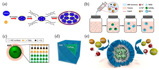 Core/shell approaches utilized with PNCs. (a) Silica-based core/shell perovskite particles. Reproduced with permission [166]; (b) Single silica-based core/shell perovskite particles. Reproduced with permission [167]; (c) AlOx shell on top of the PNCs. Reproduced with permission [168]; (d) Semiconductor shell covering PNCs. Reproduced with permission [169]; (e) Polymer-based shell. Reproduced with permission [170].