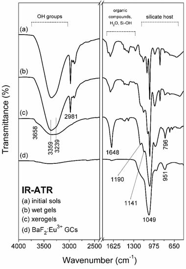 To monitor the structural differences in fabricated initial sols, wet-gels and xerogels, the IR-ATR spectra were recorded in the frequency region from 500 cm−1 to 4000 cm−1. The individual infrared signals were identified based on following papers [21,22]. The initial sols (Figure 1a) obtained directly after synthesis revealed the impressive amounts of hydrogen-bonded Si-OH groups (~3359 cm−1) originated from hydrolyzed tetraethoxysilane. Moreover, the IR signal located near ~1648 cm−1 frequency region could be also assigned to vibrations within Si-OH moieties. Based on infrared signals originated from Si-O-Si bridges (~1190 cm−1, ~796 cm−1), SiO4 tetrahedrons within Q4 (~1141 cm−1), Q3 (~1049 cm−1) as well as Q2 units (~951 cm−1), we concluded that the polycondensation reaction has been started at early stage of sol-gel transformation. The initial sols were particularly rich in C2H5OH, CH3COOH catalyst, unreacted TFA residues and water, what could be proven by strong infrared signals recorded from OH groups: ~3239 cm−1, C-H vibrations: ~2981 cm−1, ~2930 cm−1, ~2895 cm−1, C=O: ~1648 cm−1. The signals assigned to C-F vibrations inside Ba(CF3COO)2 and Eu(CF3COO)3 were also identified (near ~1190 cm−1 and ~1141 cm−1). It was observed that after one week of drying at 35 °C the initial sols were transformed into wet-gels (Figure 1b). The gelation process resulted in the formation of a liquid-filled highly porous silicate network. The indicated step of sol-gel evolution was related with gradual evaporation of water molecules and organic compounds from microporous silicate structure, which was still dynamic. Indeed, the broad OH-band (~3239 cm−1) began to decrease, similarly as in the case of C-H signals (~2981 cm−1, ~2930 cm−1, ~2895 cm−1). It is quite interesting that the amounts of water and organic solvents were still large at indicated transformation step. Such a phenomenon could be explained by low drying temperature (35 °C) and probable possibility for their successfully ‘trapping’ inside microporous silicate network due to strong hydrogen-bonding with unreacted Si-OH groups (~3358 cm−1). Simultaneously, the amounts of hydrogen-bonded Si-OH groups gradually decreased what confirmed that the polycondensation reaction was still in progress. In next six weeks, the collapse of the silicate network occurred as a result of compressive stress imposed by capillary forces of the drying liquids. In sum, we observed that the further reaction between unreacted Si-OH groups was promoted. Hence, the growing number of Si-O-Si siloxane bridges (~1190 cm−1, ~796 cm−1) reinforced the silicate network. For xerogels obtained after seven weeks from synthesis (Figure 1c), we identified the presence of vicinal or geminal Si-OH groups (~3658cm−1), hydrogen-bonded Si-OH moieties (~3359 cm−1) as well as hydrogen-bonded OH groups (~3239 cm−1) from residual water and organic solvents. The presence of Si-O-Si siloxane bridges (~1190 cm−1, ~796 cm−1) and linkages within Qn units (n = 4: ~1141 cm−1, n = 3: ~1049 cm−1, n = 2: ~951 cm−1) inside formed three-dimensional silicate network was also confirmed. Moreover, the infrared signals originated from trifluoroacetates (~1190 cm−1 and ~1141 cm−1) were also identified. It was also observed that during subsequent steps of sol-gel transformation (initial sols, wet gels and xerogels) the intensity of peak located near ~1648 cm−1 frequency region, assigned to vibrations of C=O and Si-OH groups, increased. We suppose that it resulted from densification of sol-gel materials during drying at 35 °C.