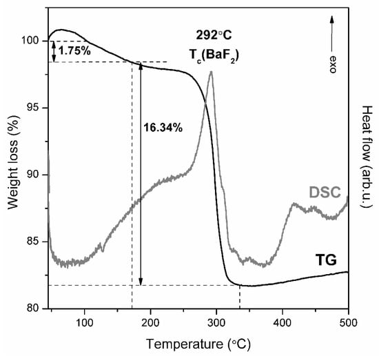 To evaluate the conditions of controlled heat-treatment to transform of fabricated xerogels into glass-ceramics, the TG/DSC analysis was carried out and the recorded curves were depicted in Figure 2. It was recorded the two-stage thermal degradation profile: the first stage was recorded in range from 40 °C to 172 °C and the second stage was recorded in range from 172 °C up to 321 °C. The first stage was registered as a gentle degradation and the resultant weight-loss was estimated to 1.75%. Such degradation step is related with evaporation of residual volatile components (water, ethanol, acetic acid, exceed of TFA acid) from porous silicate network. The remaining TFA acid reacted with acetate salts introduced during initial step of sol-gel synthesis and–in consequence of chemical reaction between them–the trifluoroacetates were obtained as products. During further rise in temperature, a strong exothermic DSC peak with maximum located at 292 °C was recorded and simultaneously, the huge weight loss was also observed (16.34%). Hence, the second degradation step was ascribed to thermal degradation of Ba(CF3COO)2 and formation of BaF2 crystal phase. Based on presented results, the 350 °C temperature was chosen to carry out the controlled ceramization process of precursor xerogels due to two reasons. Firstly, the amount of introduced Ba(CH3COO)2 during synthesis was relatively small (3.0 wt. %) and therefore, the heat-treatment performed at 350 °C ensured the crystallization process. Secondly, the resultant silicate sol-gel hosts seems to be thermally stable at 350 °C and the further rise in temperature did not caused significant changes in masses of fabricated xerogels.