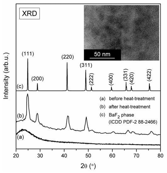 To verify the nature of prepared sol-gel samples both before and after controlled ceramization process, the X-ray diffraction measurements were carried out (Figure 3). For xerogels, a broad halo pattern characteristic for amorphous system without long-range order was recorded. The controlled heat-treatment process conducted at 350 °C was accompanied by the appearance of diffraction lines, which indicated a crystallization of fluoride phase. Indeed, the XRD patterns are in accordance with the standard diffraction lines of regular BaF2 phase from ICDD (The International Centre for Diffraction Data, PDF-2 No. 88-2466) crystallized in Fm3m space group. The broadening of recorded diffraction lines indicates that BaF2 phase crystallizes in nanometric range. The average crystals size was estimated using the Scherrer Equation (1):