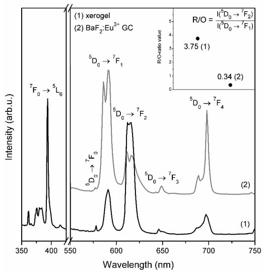 3.2. Photoluminescence of Eu3+ in Xerogels and Glass-Ceramics Containing BaF2 Nanocrystals