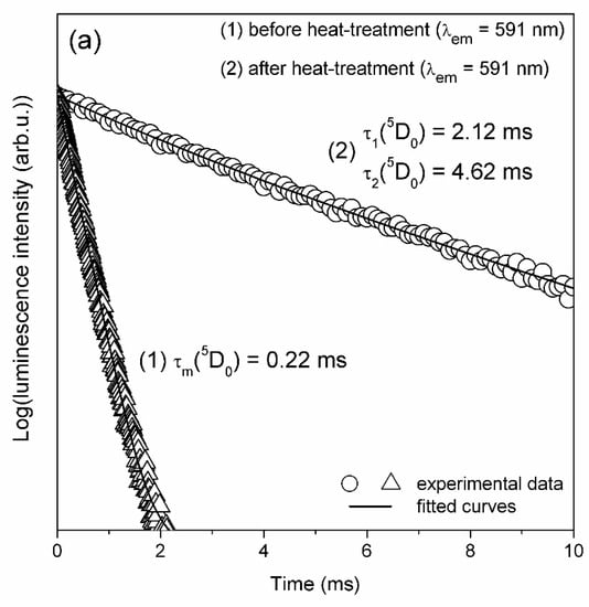 The sum of radiative (ARAD) and non-radiative (ANRAD) transition probabilities correspond to the inverse of luminescence lifetime (1/τ) obtained from decay curve measurements. For glass-ceramic with BaF2 nanocrystals the luminescence decay curve for the 5D0 (Eu3+) state is bi-exponential with two components: faster (τ1 = 2.12 ms) and slower (τ2 = 4.62 ms) (Figure 5). Thus, the average lifetime τavg of 5D0 (Eu3+) can be evaluated using Equation (4) [38]: