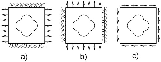 Load cases for the homogenization procedure for 2D problems. (a) , (b) , (c) .