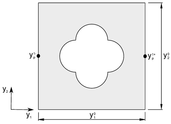 The plane stress problem described in Equation (4) is solved using periodic boundary conditions. If it is considered a periodic displacement field, then, the induced strain is expressed as the sum of a macroscopic displacement field and a periodic field [16], as follow: