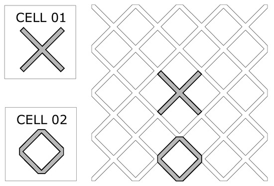 Some characteristics of the optimization problem such as: continuity, existence, and uniqueness, have to be considered in order to study the behavior of the optimization parameters. The continuity requirement can be verified looking for the design variables values that make the stiffness matrix of the Equation (9) not singular. the factor in Equation (8) is added in order to avoid the singularity of . As for the solution uniqueness, it is evident that, the solution is not unique, because there are different unit cells that generate the same PCM (see Figure 3). The appropriate selection of a solver or updating scheme for the design variables, it depends on the characteristics of the objective function. The most relevant is the monotonicity, for instance, a gradient based-method is suitable when the objective function is convex and monotonic. There is not a formal definition of monotonicity for multi-variable functions, but the evaluation of the function behavior modifying the design variables (one at a time) it is accepted as a “monotonicity” test for topology optimization problems [38,39].