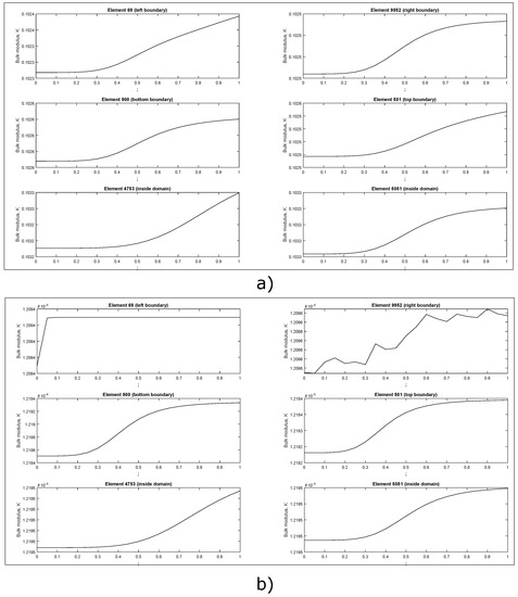 A local “monotonicity” test was performed for the bulk modulus maximization objective function, verifying 100 random elements: 40 at the top, bottom, left and right boundaries and 60 at the center of the domain. was varied in the interval , with increments of , and considering the initial guesses (a) and (b) displayed in Figure 4. In Figure 5 are presented the results. It was observed a monotonic behavior of the objective function when an uniform initial guess (Figure 4a) was considered. If a fully random initial guess (Figure 4b) is used, thus a non-monotonic behavior is obtained for some elements located in the right boundary. The same test was performed for the shear modulus maximization objective function, but it was not obtained any element with non-monotonic behavior.