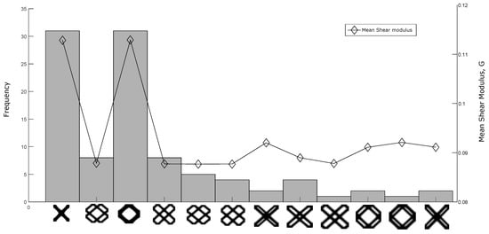Histogram of 100 runs with the obtained groups for shear modulus maximization. The left axis is the frequency and the right axis is the mean objective function value.