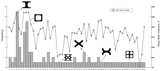 The results are presented in Figure 6 and Figure 7, where the existence of multiple local optima points is illustrated in a frequency diagram. The representative topologies for some groups and its corresponding mean objective function value are displayed in the same figures. In Figure 6 and Figure 7 it can be observed that the solutions with the best mean optimum value have a higher probability to be achieved for the shear and bulk modulus maximization, when the optimization was started from a random initial guess. Additionally it was observed that the same periodic material can be defined by different unit cells as defined in Figure 3, confirming the non-uniqueness of the solution. The objective functions for bulk and shear modulus maximization described in Section 3 are particular cases of the objective function for the general inverse homogenization problem stated in Equation (10), which is assumed more complex to solve than its particular cases. In order to compare the objective function for bulk modulus maximization and the function for general inverse homogenization, it was performed the same analysis presented in Figure 6 and Figure 7, using the stiffness tensor , obtained with the bulk modulus maximization objective function and a fully random initial guess. In this analysis, not all the solutions were feasible, only runs were 0–1 topologies, according to the following criteria:
