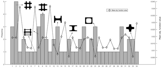 Histogram of 100 runs with the obtained groups for the general inverse homogenization objective function. The left axis is the frequency and the right axis is the mean objective function value. Only 7/34 topologies are displayed for clarity.