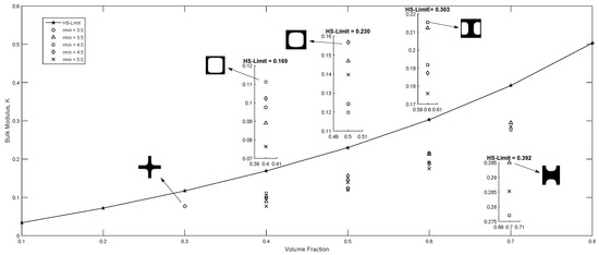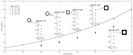 where, and are the bounds for maximum bulk and shear modulus respectively, K and G are the base material bulk and shear modulus respectively, and is the volume fraction.
