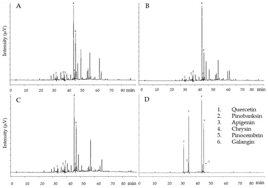 Chromatograms registered at λ 260 nm. (A) Multi dynamic extraction (M.E.D.) propolis extract A; (B) M.E.D. propolis extract B; (C) M.E.D. propolis extract C; (D) Standard compounds: 1—quercetin; 2—pinobainskin; 3—apigenin; 4—chrysin; 5—pinocembrin; 6—galangin.