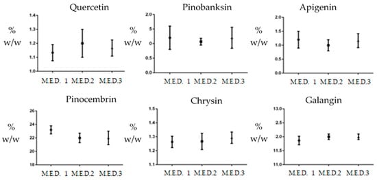 After the identification of quercetin, apigenin, pinobaskin, chrysin, pinocembrin, and galangin on the basis of their UV and mass spectra (Table 3 and Figure 2D), they were quantified by means of HPLC–UV analyses (Table 6). The chromatograms acquired at λ 260 nm for each M.E.D. propolis extract are reported in Figure 2A–C. The relative percentages of each flavonoid were tested with ANOVA, showing that no differences were found in flavonoid composition between the non-ethanolic M.E.D. propolis extracts (Figure 3).