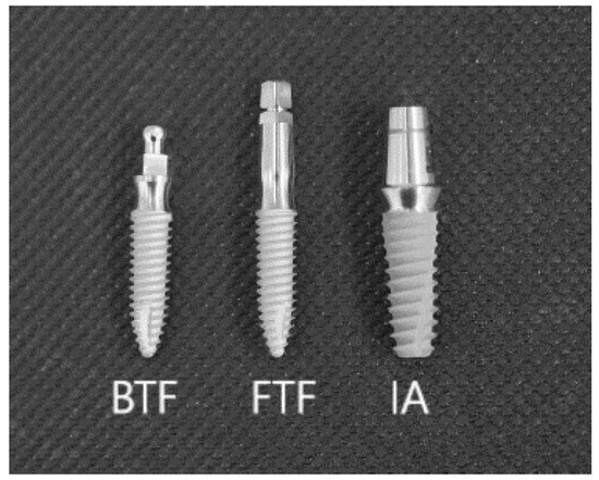 Type of grade 4 titanium alloys implants used in the study (BTF—ball type fixture; FTF—fix type fixture; IA—implant-to-abutment connection of two-piece implants).