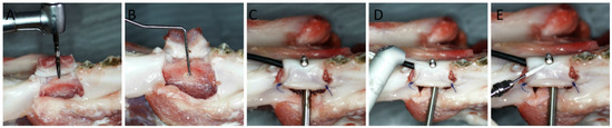 Surgical and measurement procedures used in the study. (A) The implant bed preparation. (B) Prepared implant bed and a hole with a diameter of 3 mm at mid-height of the buccal side of the implant bed for a Thermocouple Probe placement. (C) The implant, with two probes placed at mid-height and collar level of the implant. (D) Er:YAG laser with a sapphire tip before debridement procedure. (E) The scaler with a plastic tip before debridement procedure.