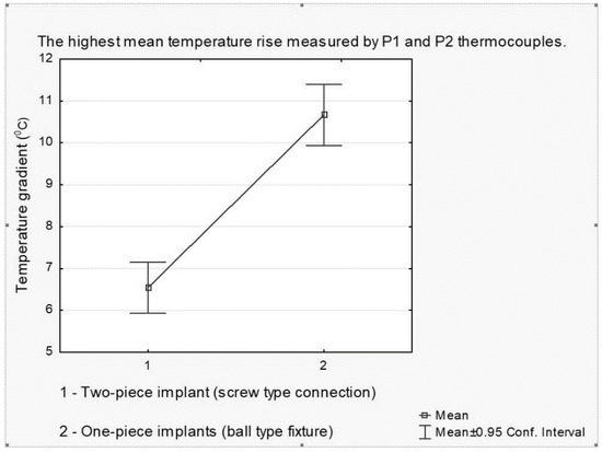The analysis showed that, after 60 s of flapless debridement with Er:YAG at 200 mJ/30 Hz, the temperature increase by the critical 10 °C (10.67 ± 1.14 °C) was noted for the ball type fixture (BTF) of the one-piece implant at the abutment level (P2 thermocouple). However, the highest mean temperature growth (6.54 ± 0.96 °C) measured by the P1 thermocouple at the mid-side of the two-piece implant was below 10 °C (Figure 4).