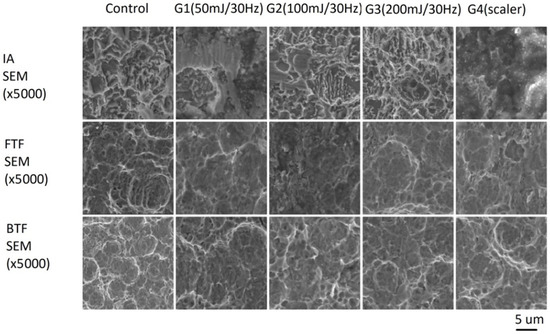 G4 group (control): ultrasonic scaler (PM200, EMS, Nyon, Switzerland with a plastic tip at 4 W/20 Hz.), power: 4 W, frequency: 20 Hz, water spray cooling: 30 mL/min (Table 1).