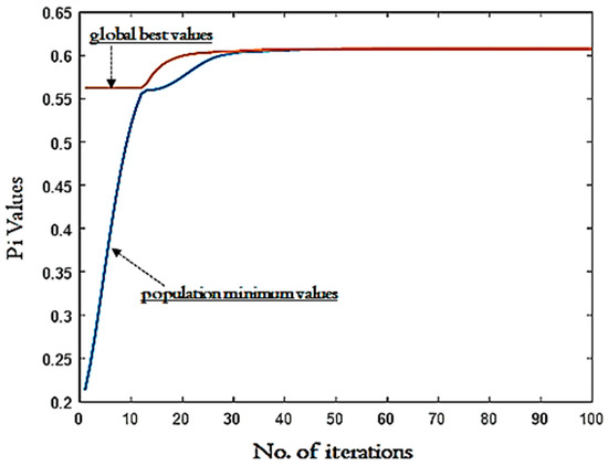 In addition, the inertia weight is also selected in the range of 0.4 to 1. Other criteria required for the calculation of optimized setting for Pi values are the acceleration coefficients (i.e., C1 (i.e., cognitive parameter) and C2 (i.e., social parameter) as 1.35 and 2.45, respectively). These coefficients are required to evaluate the response in the search space more efficiently. The basic equations to calculate the values of C1 and C2 are the iteration value dependents. These values vary between 1 and 4 depending on the population, generation, computation complexity. These acceleration coefficients along with the inertia weight help to enhance the efficiency and control the converge rate of PSO. The output predicted using PSO depicts the two best solutions, one refers to the own best and the other refers to the global best. With the increase in the number of iterations, generation and population, the best solution is obtained. In the present work, the optimized value of Pi suggested by PSO is 0.6074. Figure 4 shows the convergence that occurred until reaching the optimized Pi value. It is evident from Figure 4 that after 30 iterations the global best solution was obtained. In Figure 4, the convergence between the population minimum value and global best value takes place. When both lines intersect, the best solution is obtained which is 0.6074 in the current case. Figure 5 of Weibull distribution also verifies the results of the global best solution. The position of global best suggested by PSO is cutting speed 194 m/min, depth of cut of 0.1 mm, feed rate of 0.15 mm/rev, and cutting length of 120 mm. It should be stated that this solution strikes a balance between achieving lower surface roughness in terms of Ra and Rq, with reaching the highest possible material removal rate. Table 6 shows a comparison between the optimal solutions in three cases:
