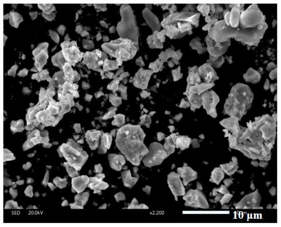 Ti (aladdin, 99.5% purity, Shanghai, China), Al (aladdin, 99.4% purity), and B (aladdin, 99.99% purity) powders were chosen as the starting materials in this study. The sizes of Ti, Al, and B powders were about 65, 80, and 40 μm, respectively. Ti–Al and Ti–Al–B alloying powders were prepared in our lab according to Table 1. Ti–Al alloy was denoted as T, and Ti–Al–B alloy was denoted as TB. The preparation process was as follows: the corresponding powders were well mixed together by using a planetary ball mill. The mixed powders were heated to 1100 °C for 40 min in a vacuum furnace. The alloying powders were ground in a high-energy mill machine for 12 h. The size of the prepared alloying powder was about 10 μm (see Figure 1). A graphite die (inner diameter: 30 mm) was used to fabricate the bulk alloys. Samples were sintered by using a powder metallurgy technique in a vacuum hot-pressing furnace when the vacuum degree reached up to 10−2 Pa. Samples were sintered at 1200 °C under a pressure of 3.5 × 10−7 Pa for 45 min. After being sintered, the samples were taken out from the furnace and cut into appropriate sizes.